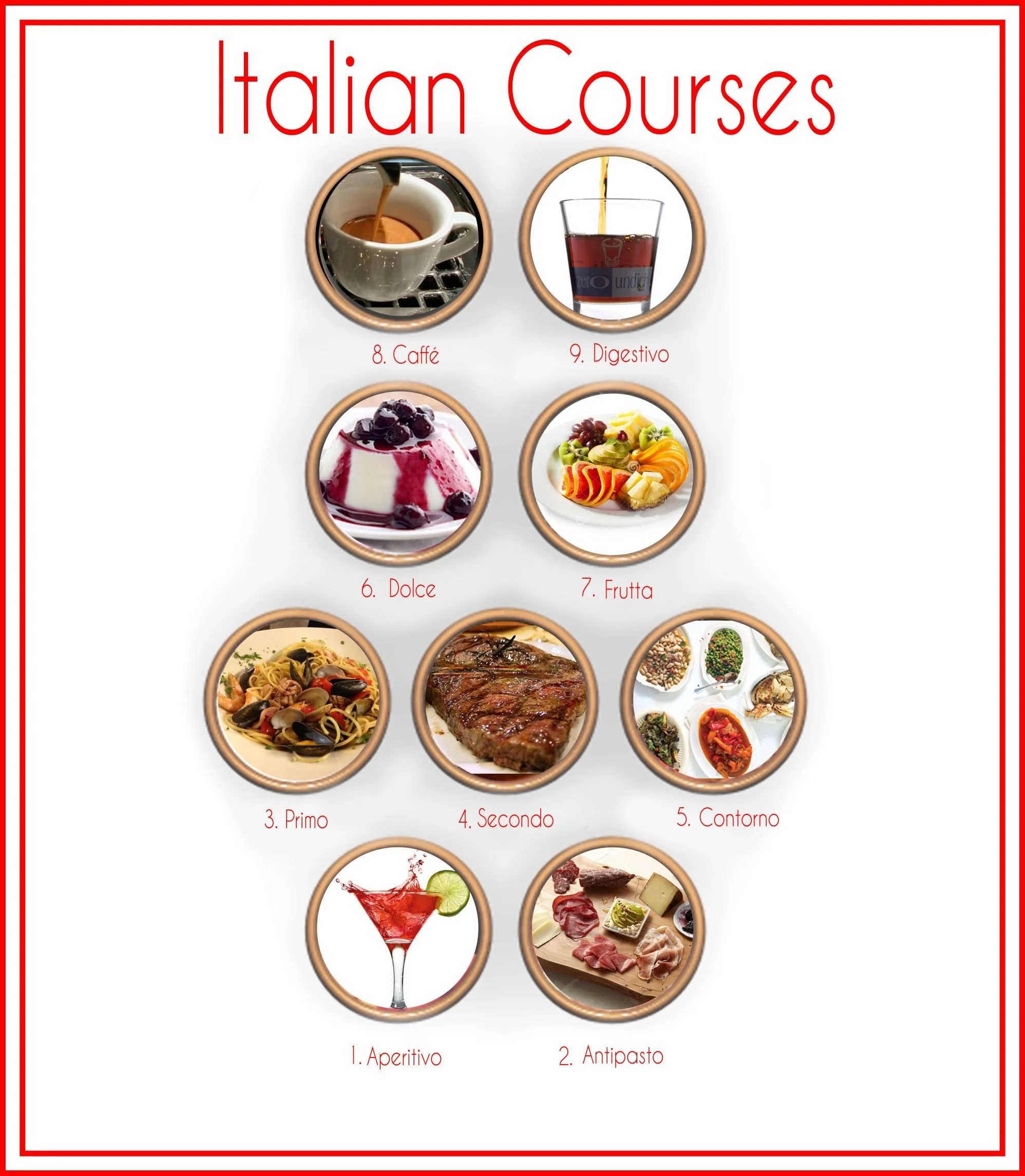 The antipasto course is your appetizers. This is the traditional first course . Usually made of bite-size small portions and served on a platter from which everyone serves themselves, the purpose of antipasti is to stimulate the appetite.